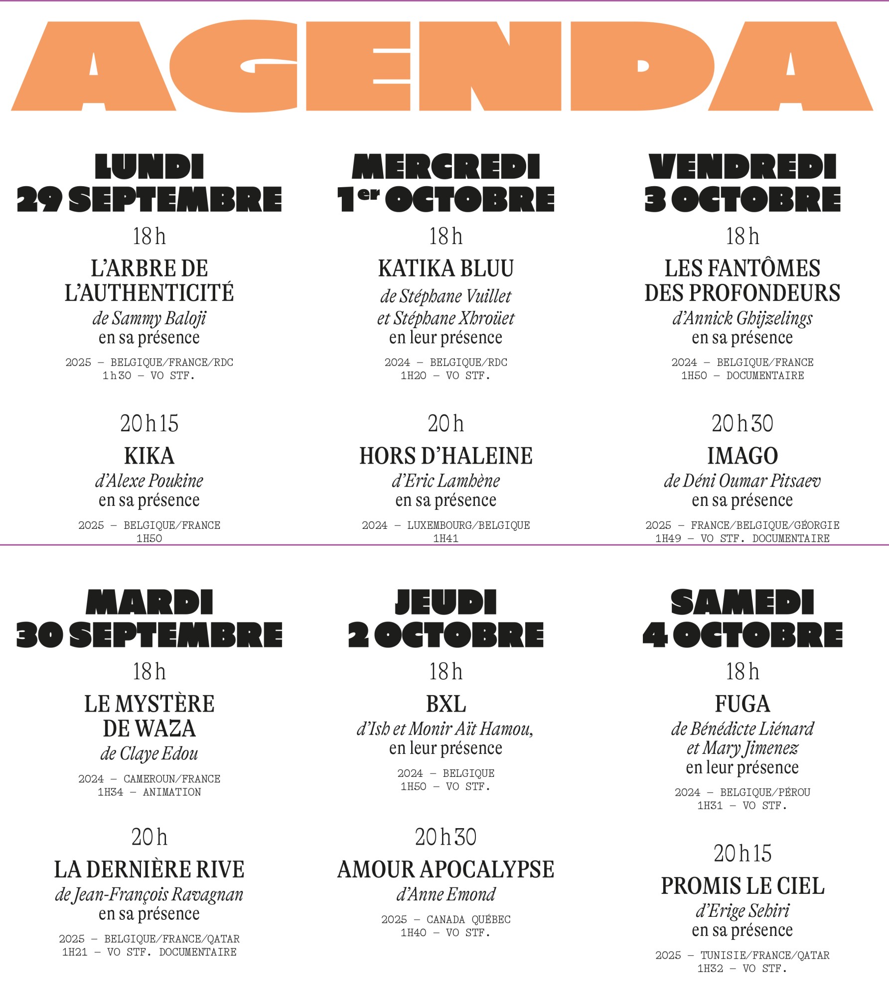 Au programme, une sélection de douze longs métrages inédits dans les salles françaises : documentaires, fictions et animations, issus de dix pays de l’espace francophone, qui donnent de nombreuses visées à notamment sonder les enjeux post-coloniaux liés à la biodiversité, à questionner les complexités et tiraillements de nos sociétés contemporaines, à disséquer les régimes d’historicité, de pouvoir et de domination et qui donnent encore à esquisser des futurs réconciliés, non fatals…