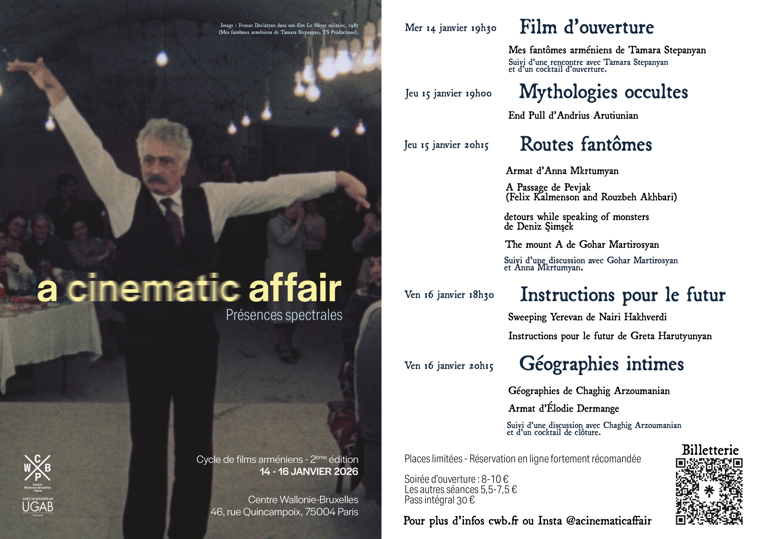 Après une édition inaugurale ancrée dans le cinéma de l’ère de l’indépendance arménienne, a cinematic affair - Présences spectrales présente des oeuvres contemporaines de réalisateur·ices et artistes arménien·nes et de diaspora, ainsi que celles de cinéastes venu·es d’Iran, du Canada et de Turquie dont le travail entre en résonance directe avec l’histoire et le territoire arméniens.