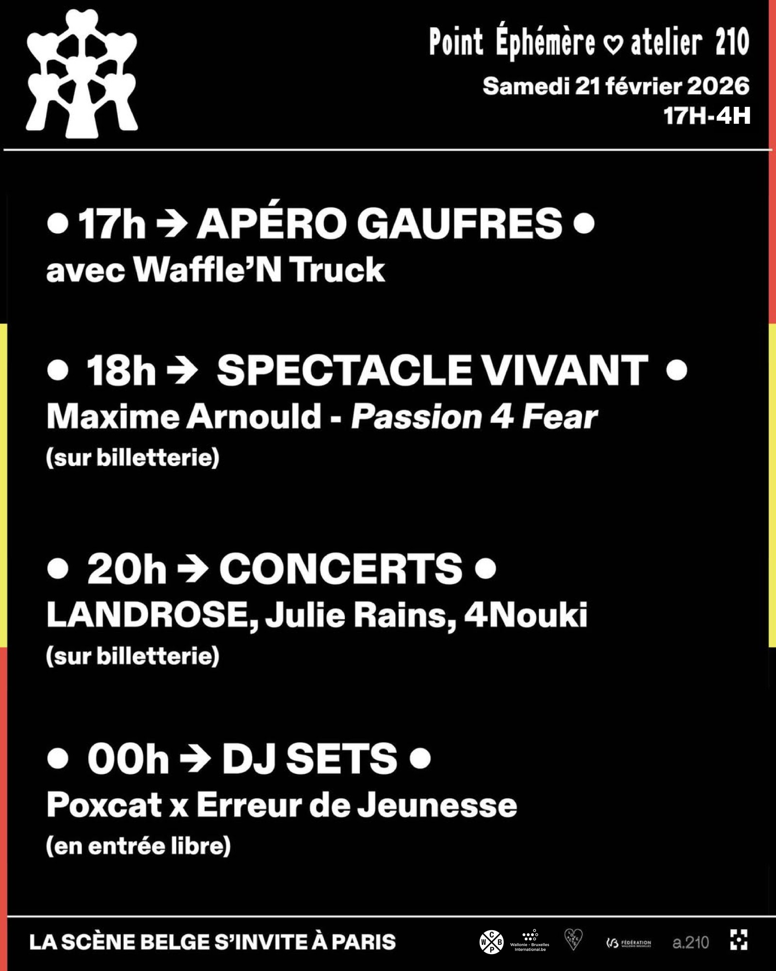 Une journée entre Paris et Bruxelles ! Point Éphémère invite atelier 210, le lieu pluri-disciplinaire bruxellois pour une co programmation de concerts, de spectacle vivant et de dj sets ! Le meilleur des deux mondes.