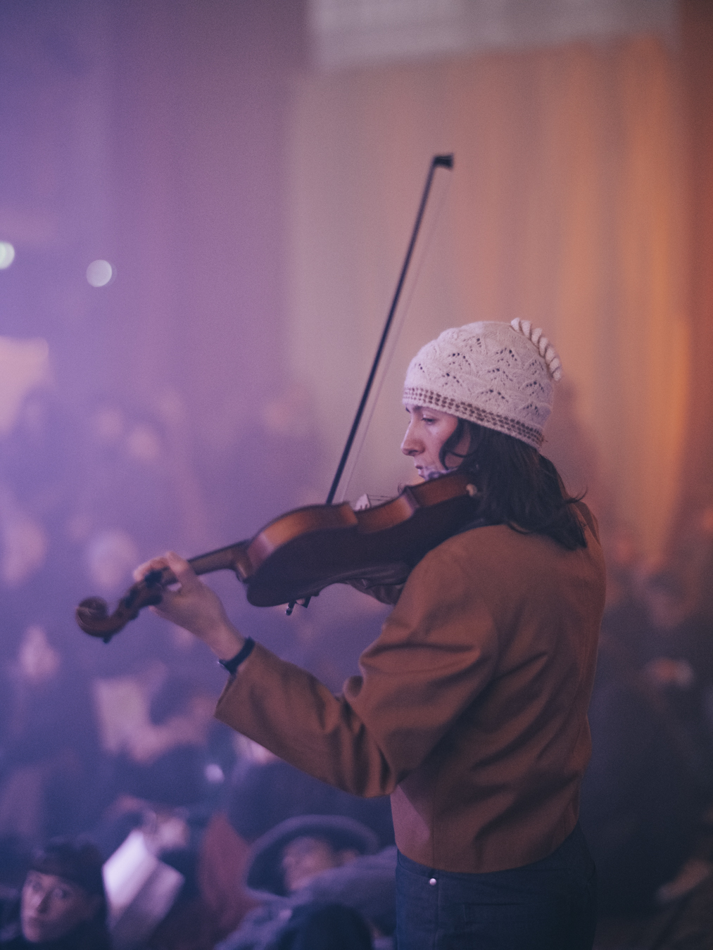 Le violon agit comme un fil conducteur, s’inscrivant dans le paysage sonore et dialoguant avec les enregistrements de terrain. La pièce est spatialisée et diffusée sur un système quadriphonique, permettant une circulation des sons dans l სივრც et une immersion accrue du public. Cette dimension spatiale prolonge l’expérience de l’écoute in situ et restitue la dynamique du milieu forestier.