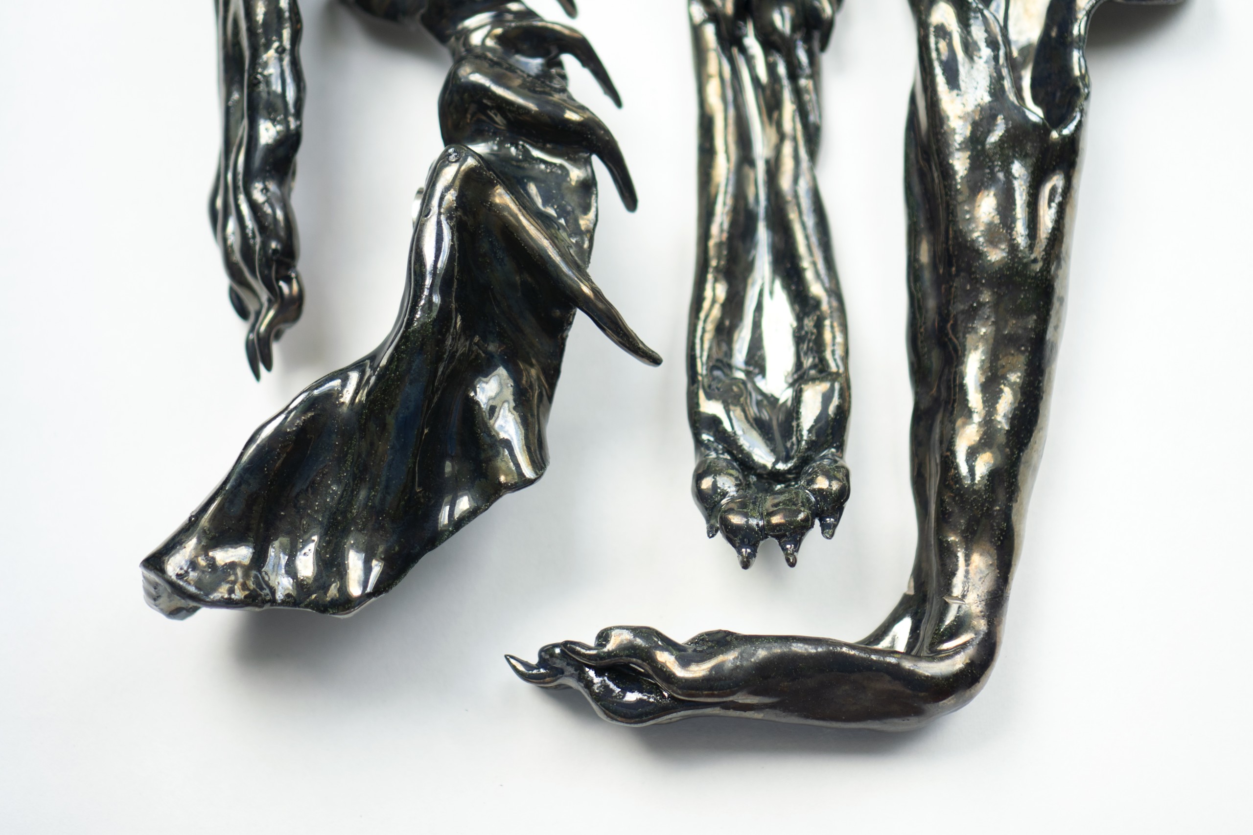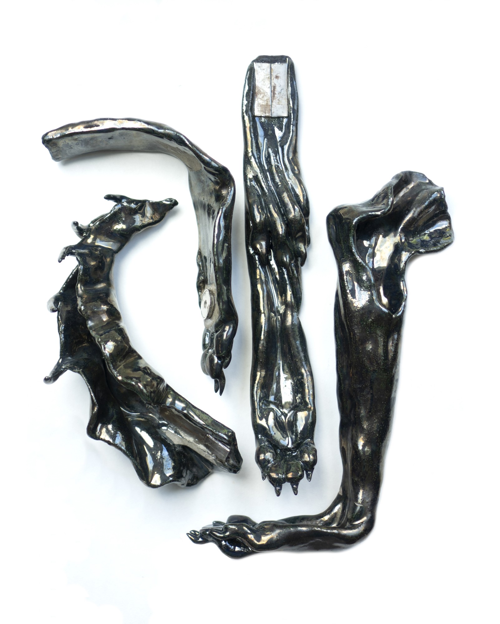 Ces bas-reliefs en céramique s’apparentent à des scènes de dévoration. Manger l’autre, le digérer, et finalement peut-être l’incorporer. Une mue de chien enveloppe ce qui préfigure un museau, lui-même se dissolvant, parfois mordant une main, elle aussi tantôt mâchoire, tantôt support, entremêlant chien et louve, humains ou coquillages sans hiérarchie aucune. Une façon aussi de penser la vie « comme une circulation, comme un don d’une communauté d’ancêtres, et la mort comme un recyclage, un flux qui se poursuit dans une communauté écologique et ancestrale d’origines »[1].
