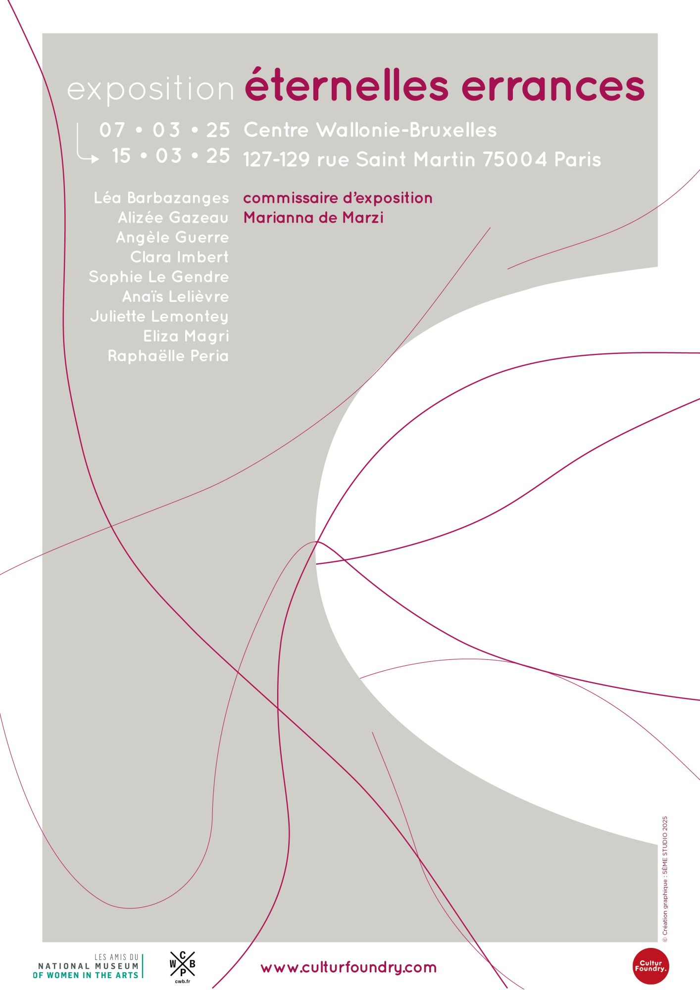 éternelles errances est une exposition soutenue et réalisée par CulturFoundry, en partenariat avec les Amis du NMWA (National Museum for Women in the Arts). Ces deux associations unissent leur force, engagées dans la promotion et l’accompagnement de la création contemporaine. Pour cette exposition, les amis de CulturFoundry ont sélectionné les univers de 9 artistes parmi 60 ayant participé aux 5 éditions du programme de mentorat « Une artiste-une entrepreneure », initié par les Amis du NMWA.