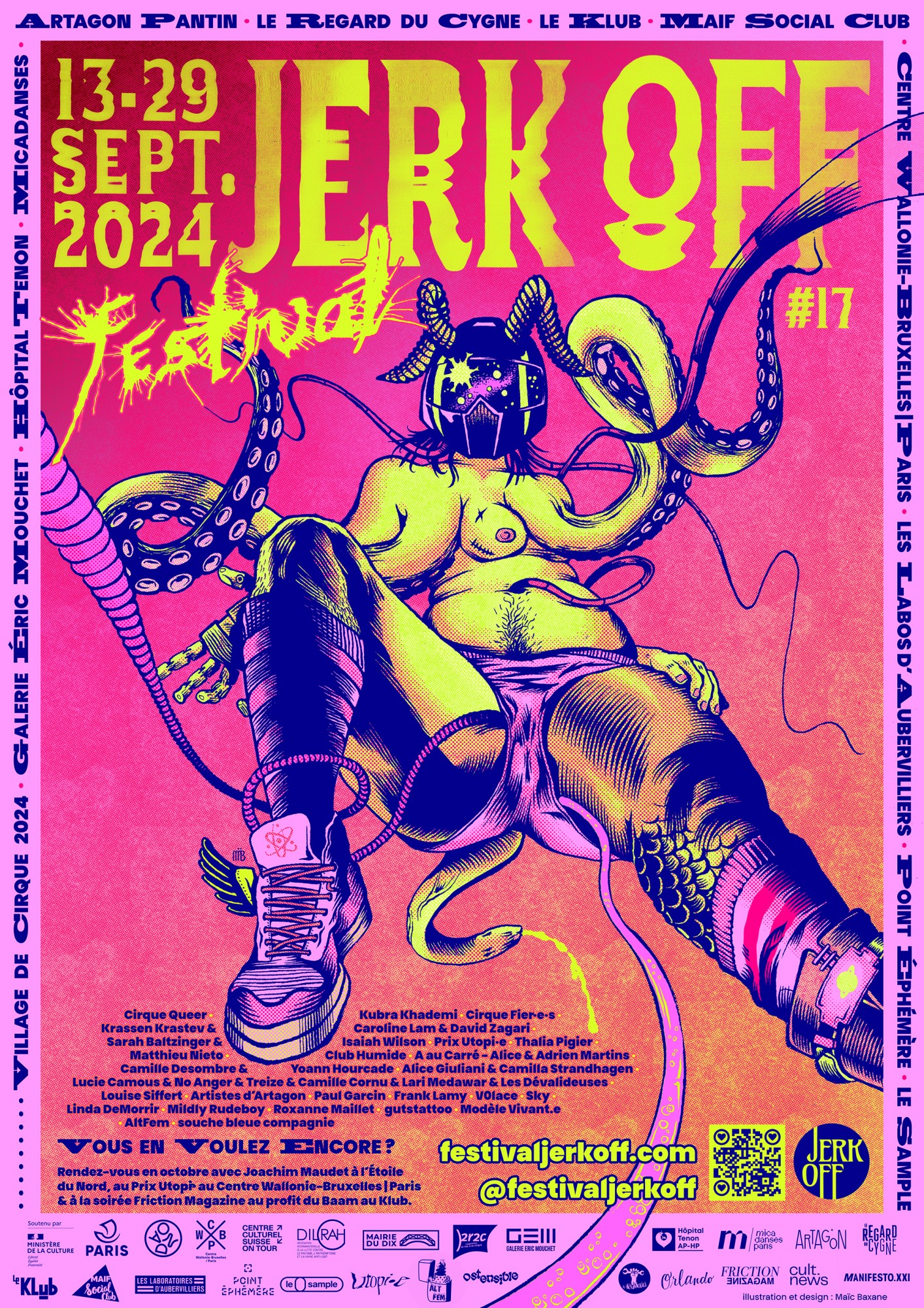 Enfin, pour permettre à toustes de participer, nous faisons tout pour être encore plus accessibles, nos tarifs n’ont pas augmenté, et nous vous proposons encore plus d’événements gratuits. Cette année, plus que jamais, quelle que soit la forme artistique, Jerk Off est un endroit sûr, où les seules règles sont la bienveillance, l’écoute et le respect de toustes.
