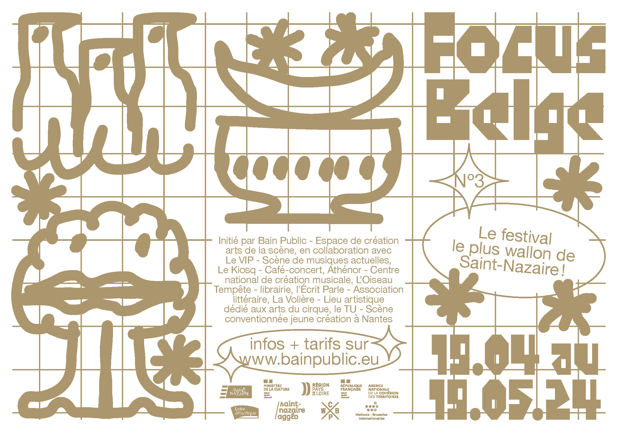 Le Focus Belge est une invitation collective à découvrir la richesse de la création belge d’aujourd’hui. Une programmation pluridisciplinaire et éclectique qui se décline en avril et mai 2024 dans différents lieux de la ville de Saint-Nazaire : Bain Public - Espace de création arts de la scène, Le VIP - Scène de musiques actuelles, Le Kiosq - Café Concert, Athénor - Centre national de création musicale, l’Oiseau Tempête - Librairie indépendante, l’Ecrit Parle - Association littéraire, La Volière - Lieu artistique dédié aux arts du cirque et le TU-Nantes - Scène conventionnée jeune création.