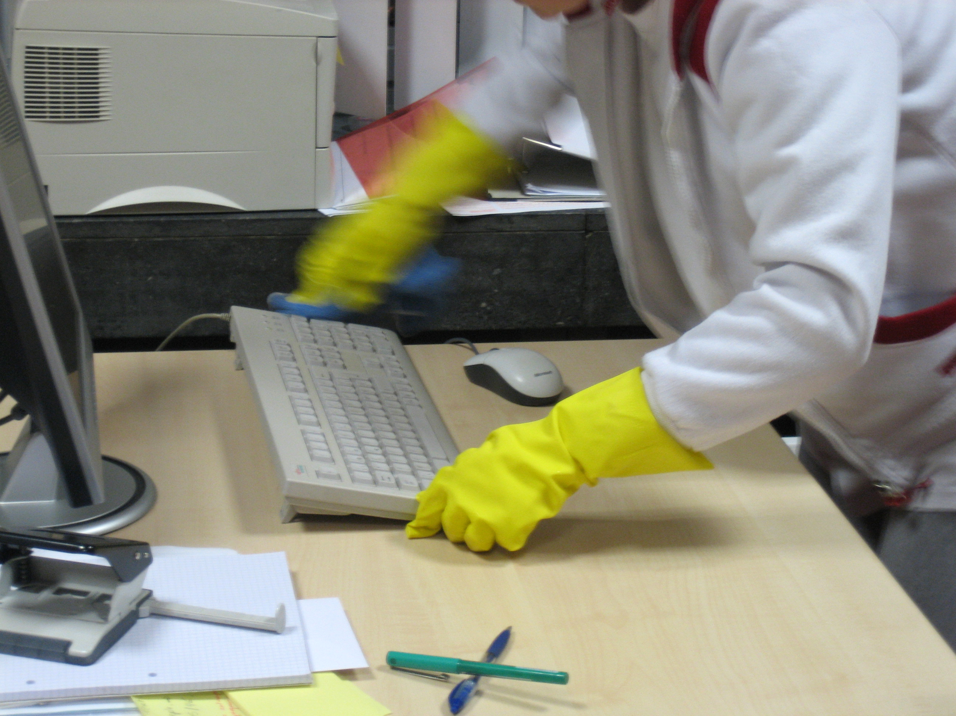 La caméra suit les mains et les gestes de deux techniciennes de surface parcourant un centre culturel en Flandre, à 6h du matin, du bureau du directeur situé au troisième étage jusqu’aux toilettes publiques en sous-sol.