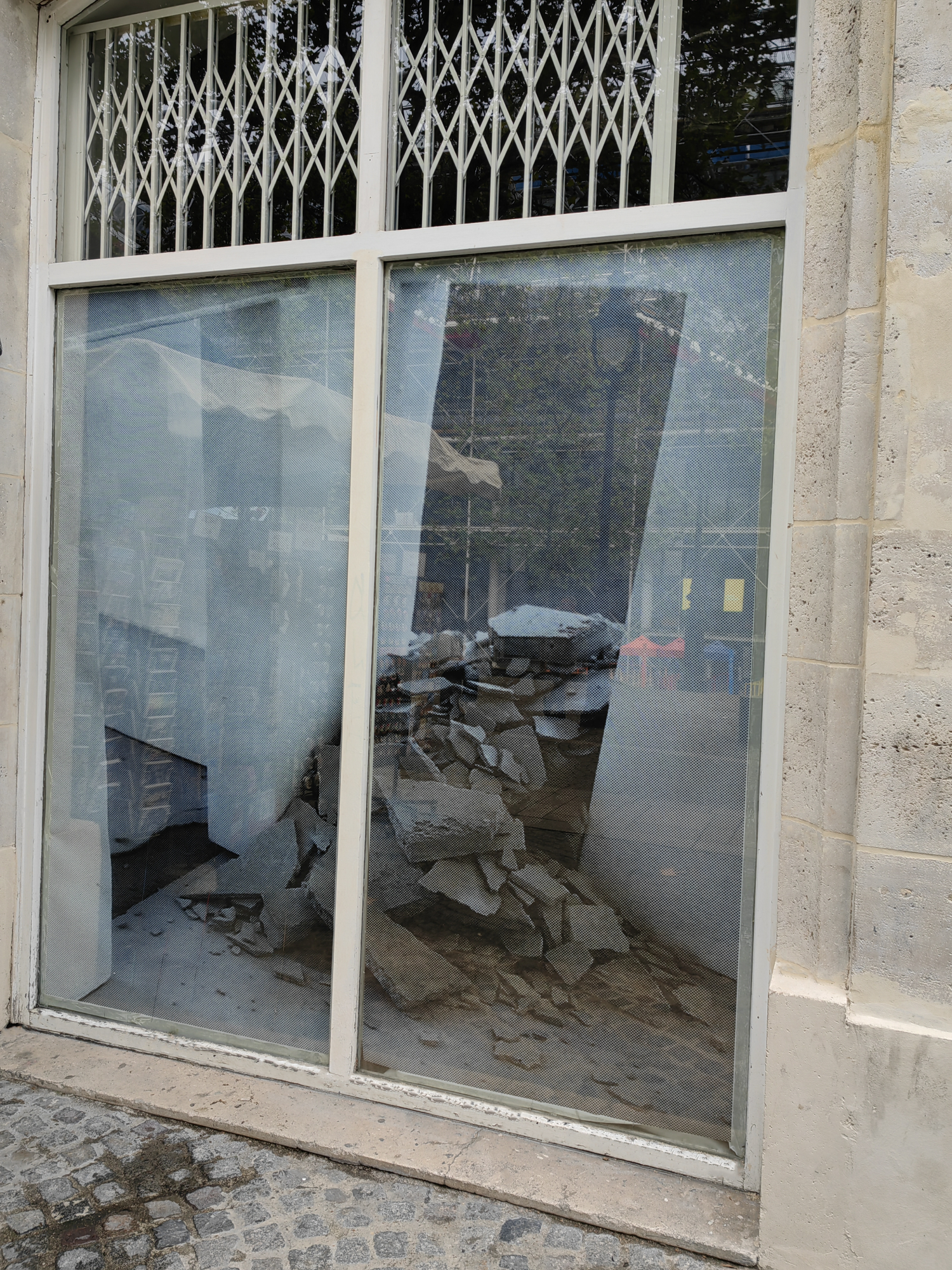 La plus grande des trois images présentées sur les vitrines du Centre, Basement scale shake, est l’agrandissement d’une photographie d’une maquette.