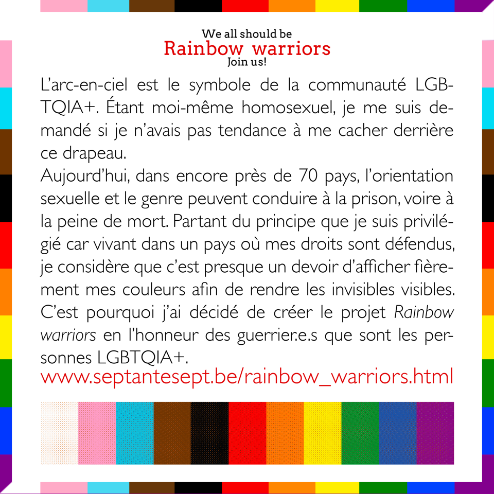 L’arc-en-ciel est le symbole de la communauté LGBTQIA+. C’est maintenant connu dans le monde entier. Doit-il nous protéger ou faut-il s’en dissocier pour se montrer ? Aujourd’hui, dans encore près de 70 pays, l’orientation sexuelle et le genre peuvent conduire à de la prison, voire à la peine de mort. C’est pourquoi le projet Rainbow warriors fait honneur aux guerrier.e.s que sont les personnes LGBTQIA+. Si vous faites partie de la communauté LGBTQIA+ et que vous voulez représenter les invisibles et faire bouger les choses, venez réaliser votre portrait tout au long de la soirée avec Pierre Marino-Smette, le photographe auteur de ce projet !
