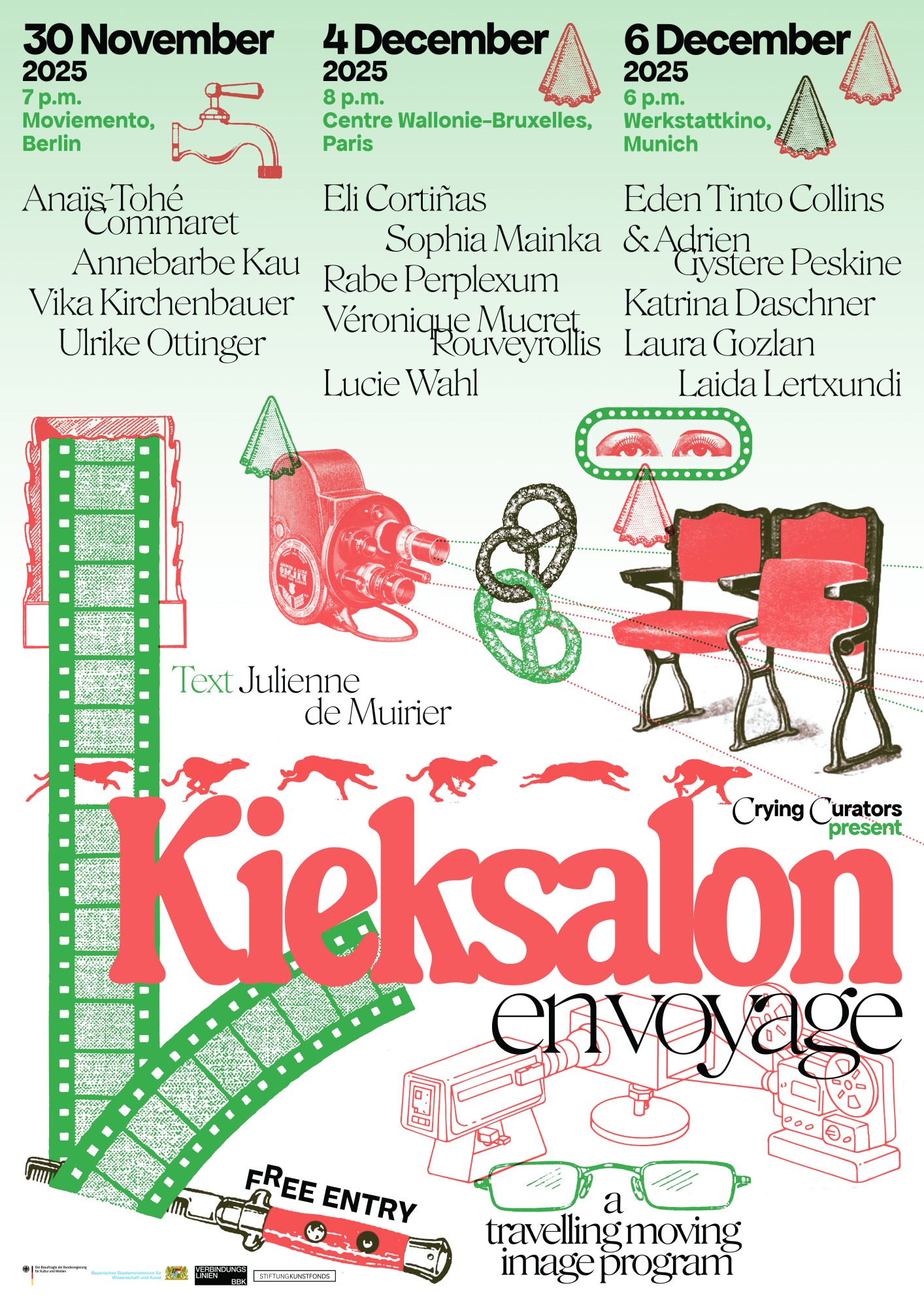 « Nous projetons des films d’Eden Tinto Collins & Adrien Gystere Peskine, Anaïs-Tohé Commaret, Crying Curators, Eli Cortiñas, Katrina Daschner, Laura Gozlan, Annebarbe Kau, Vika Kirchenbauer, Laida Lertxundi, Sophia Mainka, Ulrike Ottinger, Rabe Perplexum, Véronique Mucret Rouveyrollis et Lucie Wahl – dans les villes où nous vivons et travaillons : Munich (Werkstattkino, 6 décembre, 18 h), Berlin (Moviemento, 30 novembre, 19 h) et Paris (Centre Wallonie-Bruxelles, 4 décembre, à partir de 19h30). »
