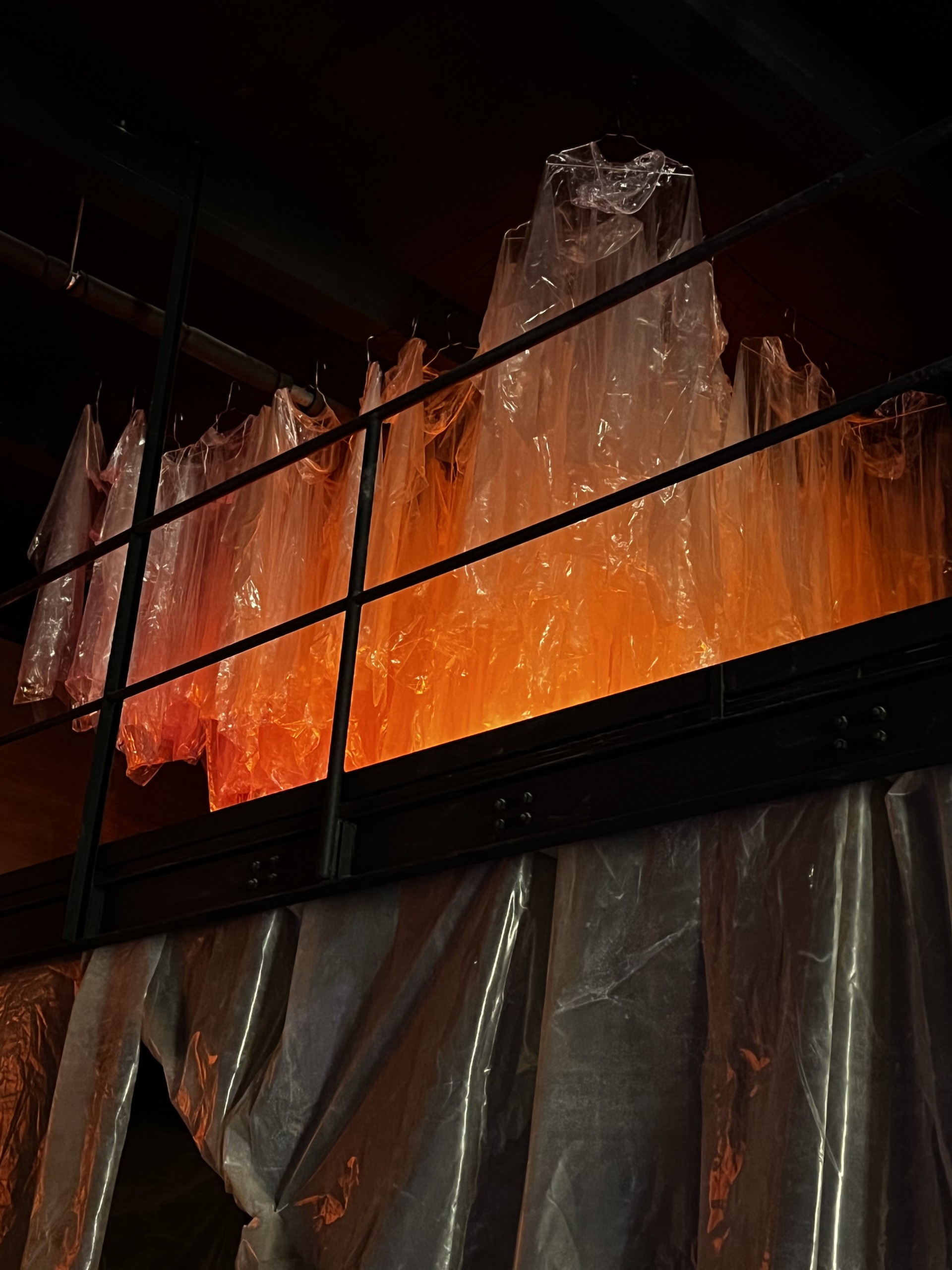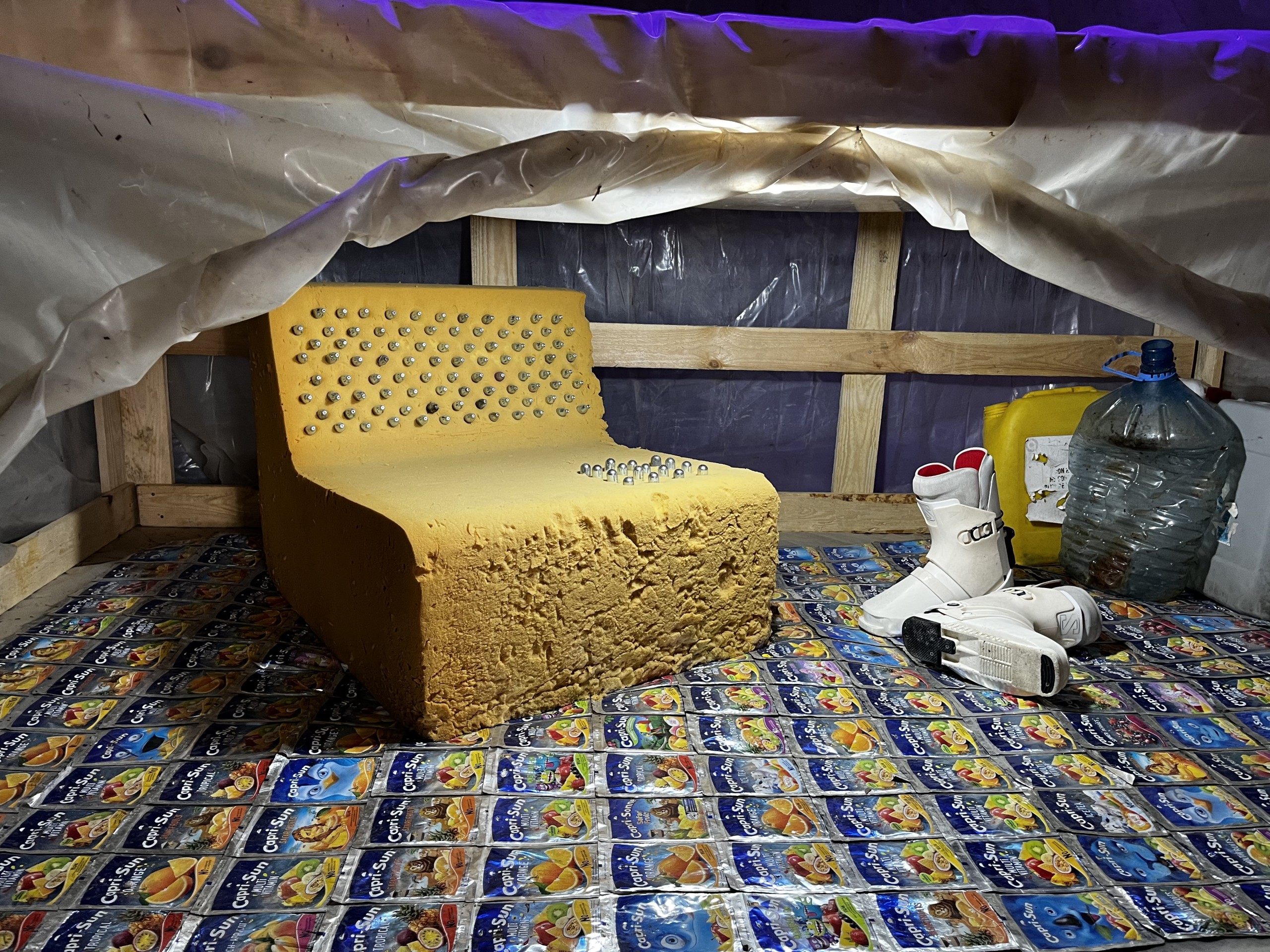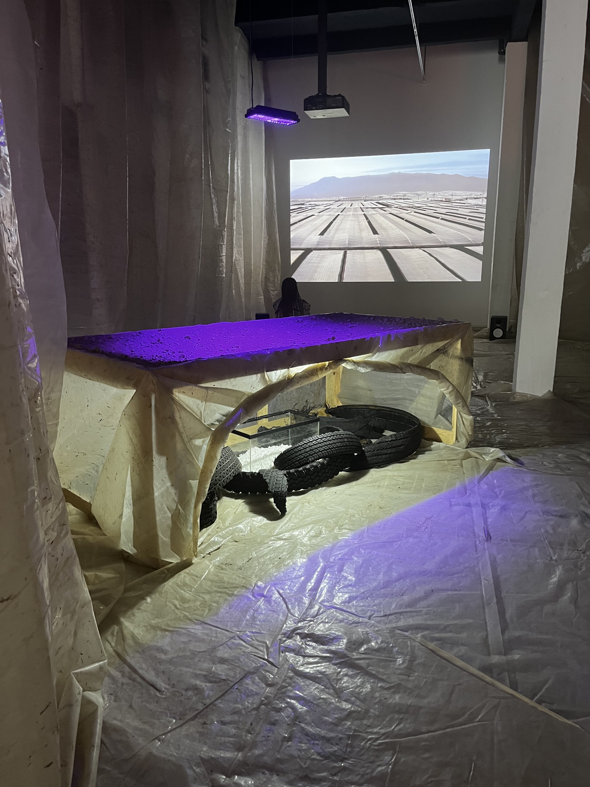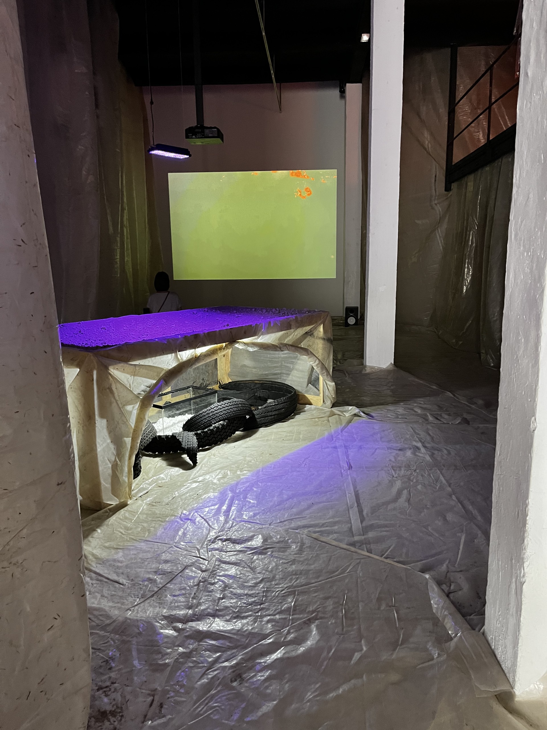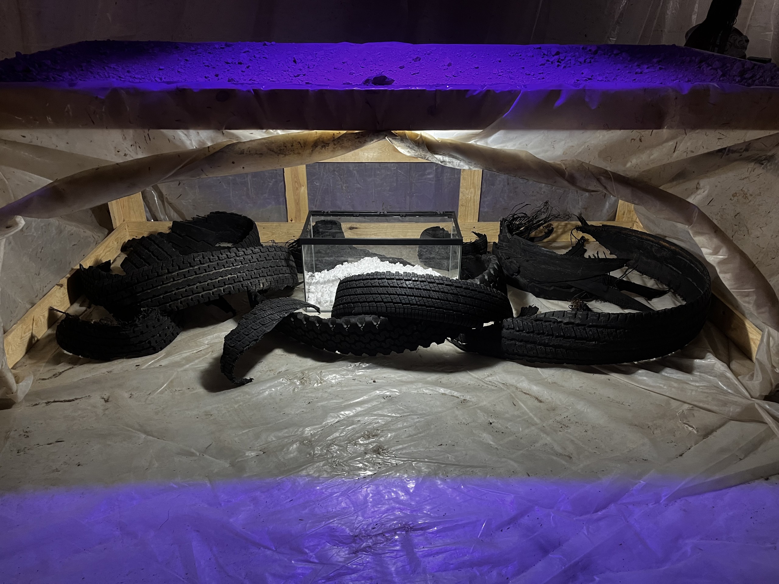 Je vois l’ensemble comme un décor de théâtre et chaque objet comme un accessoire. Par exemple, avant cette exposition, j’avais déjà utilisé les pneus déchirés ou les peintures au spray. De la même manière, la bâche pourrait me servir à créer des volumes différents, les plaques de polycarbonate qui couvrent la vitrine sont présentes pour diffuser cette importante entrée de lumière dans l’espace, au delà de leurs caractéristiques plastiques et l’histoire qu’elles portent.