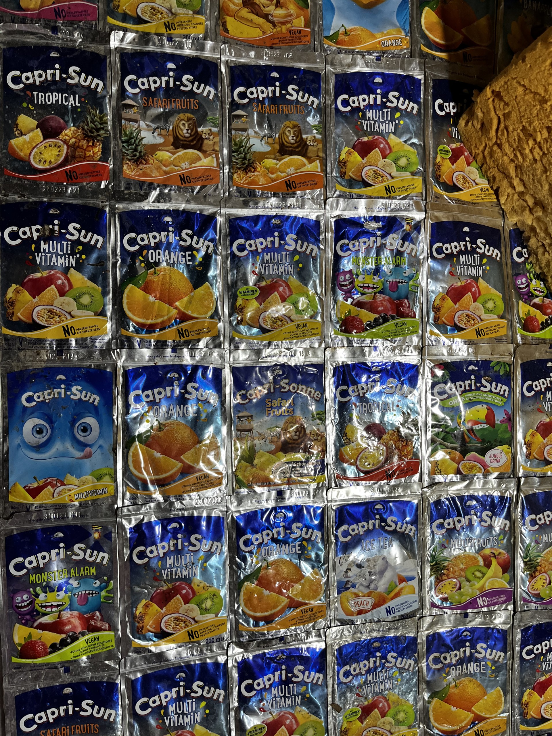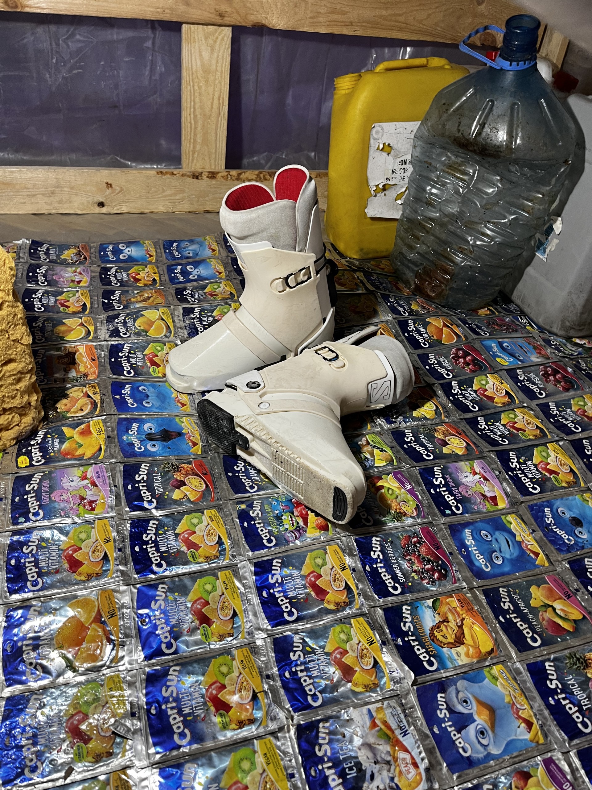 Cette idée de restes collait parfaitement à l’état des lieux filmés, mais aussi au bric-à-brac que je voulais ramener dans l’espace, notamment divers emballages “collectionnés” dans les rues de Bruxelles (boîtes de sandwiches, emballages de jus de fruits, etc…).