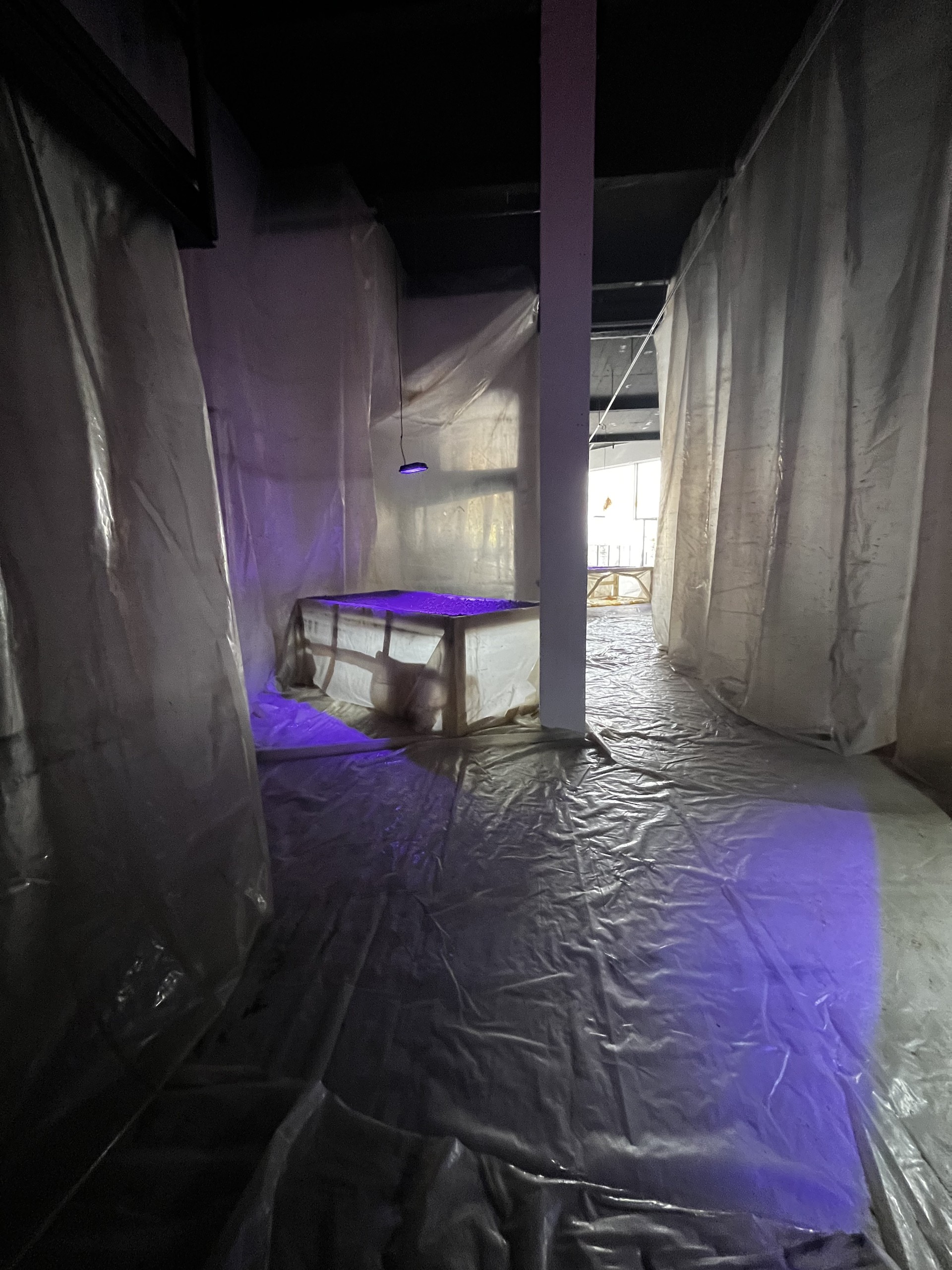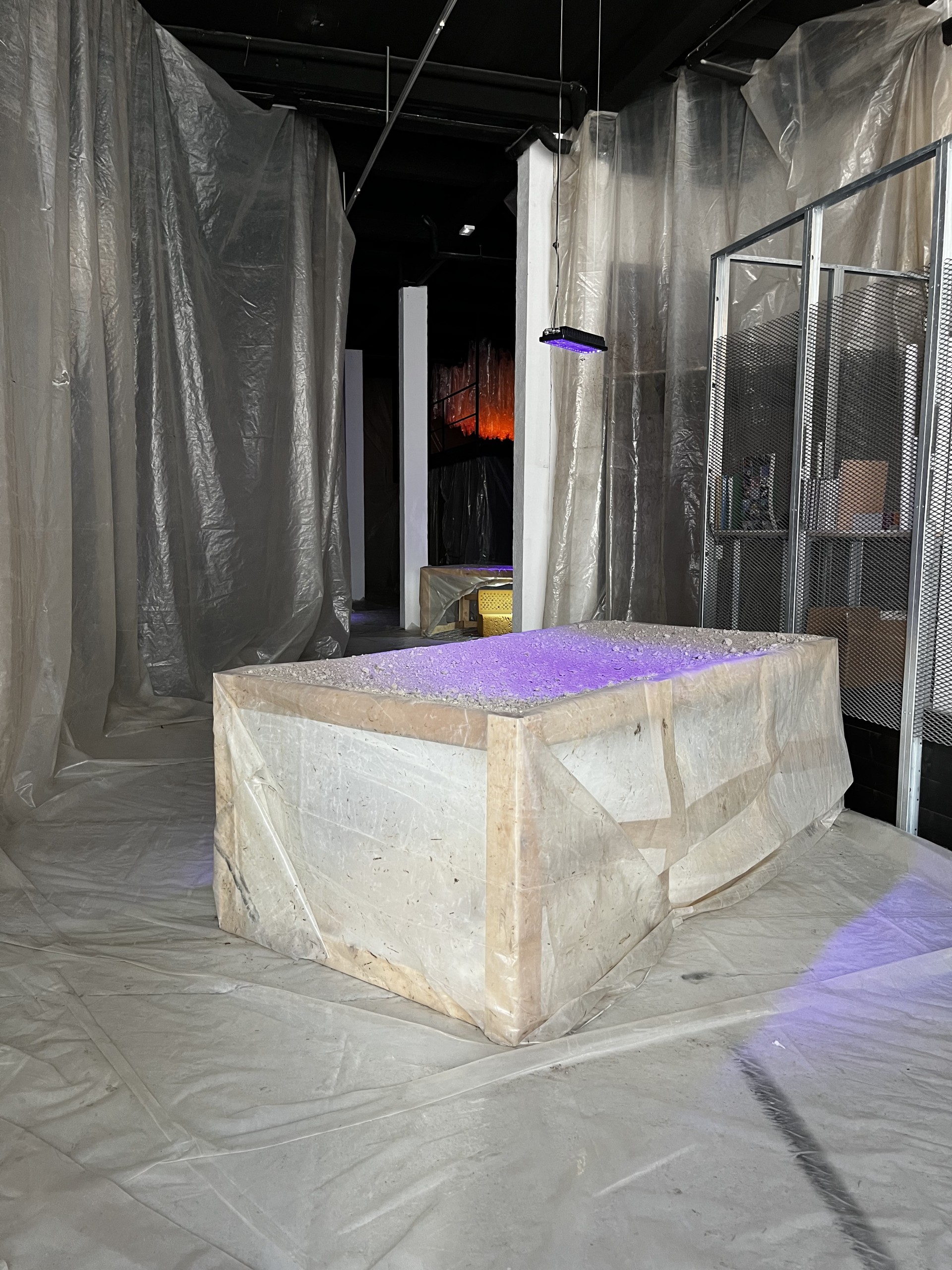 Ce même double-sens se retrouve dans le choix de la bâche de maraichage qui descend des murs et recouvre le sol. Elle a été récupérée auprès d’un agriculteur de la région et les nombreuses traces, plis et déchirures témoignent de son usage passé, de ce qui a poussé dessous. Elle dessine aussi dans l’espace une nouvelle géographie, des cavités et des pleins, de nombreux plis qui peuvent se lire comme un paysage.